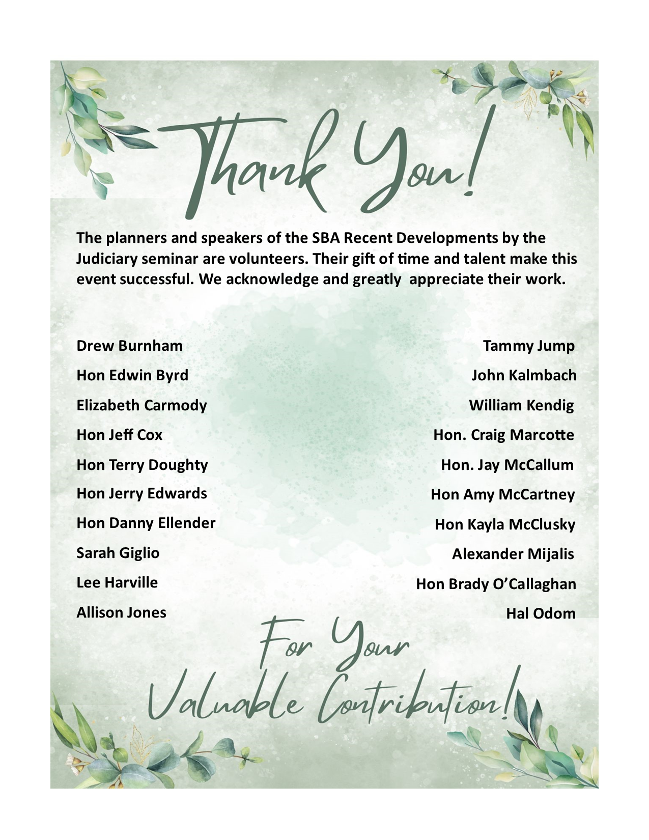 Welcome and thank you for choosing the 2025 Recent Developments by the Judiciary seminar for your continuing legal education. There is a spectacular lineup of courses and speakers that will make this seminar the best ever. Below are the links to the materials for both Wednesday and Thursday.