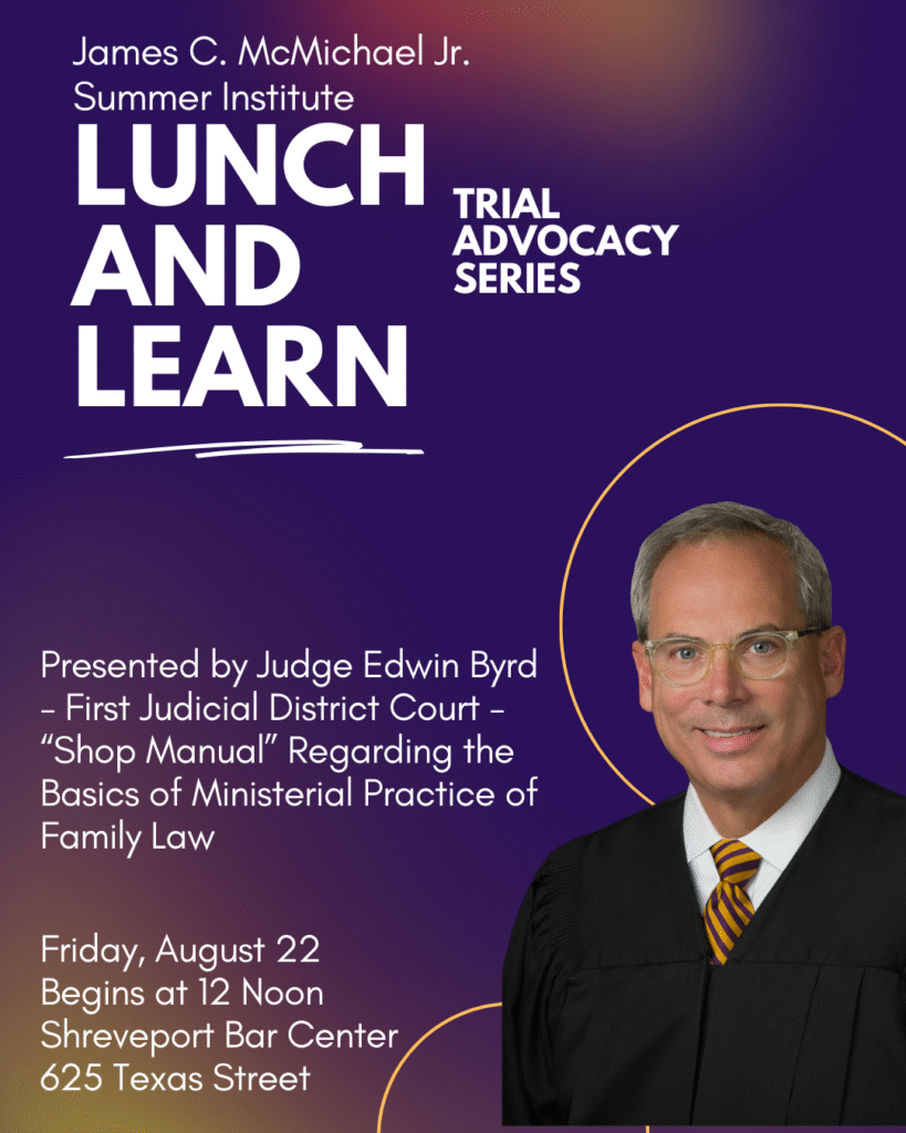 2025 Lunch & Learn CLE James C. McMichael Jr. Summer Institute Lunch and Learn Trial Advocacy Series Aug 22 * 12pm- 1pm Download registration form for mailing in your payment 2025 Lunch & Learn Registration Form X/TwitterThis field is for validation purposes and should be left unchanged.Name* First Last Email* PhoneBilling Address* Street Address Address Line 2 City AlabamaAlaskaAmerican SamoaArizonaArkansasCaliforniaColoradoConnecticutDelawareDistrict of ColumbiaFloridaGeorgiaGuamHawaiiIdahoIllinoisIndianaIowaKansasKentuckyLouisianaMaineMarylandMassachusettsMichiganMinnesotaMississippiMissouriMontanaNebraskaNevadaNew HampshireNew JerseyNew MexicoNew YorkNorth CarolinaNorth DakotaNorthern Mariana IslandsOhioOklahomaOregonPennsylvaniaPuerto RicoRhode IslandSouth CarolinaSouth DakotaTennesseeTexasUtahU.S. Virgin IslandsVermontVirginiaWashingtonWest VirginiaWisconsinWyomingArmed Forces AmericasArmed Forces EuropeArmed Forces Pacific State ZIP Code Are you currently a member of the Shreveport Bar Association or Legal Community Support Staff Committee, YLS member of the Shreveport Bar Association or Current Law Student?* Yes, SBA and LCSSC Yes, SBA YLS Member or Current Law Student No Non-Member SignupWhich sessions would you like to attend?*Please selectBoth Sessions:Session 1:Session 2:Please Select One or Both Sessions Session 1 — JULY 25: Presented by Judge Mark Hornsby, U.S. Magistrate Judge – U.S. District Court for the Western District of Louisiana; and SBA President, Elizabeth Carmody – Cook, Yancey, King & Galloway Session 2 — AUGUST 22: Presented by Judge Edwin Byrd – First Judicial District Court Both Sessions — JULY 25 and AUGUST 22 SBA and LCSSC Member SignupWhich sessions would you like to attend?*Please selectBoth SessionsSession 1Session 2Please Select One or Both Sessions Session 1 — JULY 25: Presented by Judge Mark Hornsby, U.S. Magistrate Judge – U.S. District Court for the Western District of Louisiana; and SBA President, Elizabeth Carmody – Cook, Yancey, King & Galloway Session 2 — AUGUST 22: Presented by Judge Edwin Byrd – First Judicial District Court Both Sessions — JULY 25 and AUGUST 22 SBA YLS Member or Current Law School Student SignupWhich sessions would you like to attend?*Please selectBoth Sessions: $0.00Session 1: $0.00Session 2: $0.00Please Select One or Both Sessions* Session 1 — JULY 25: Presented by Judge Mark Hornsby, U.S. Magistrate Judge – U.S. District Court for the Western District of Louisiana; and SBA President, Elizabeth Carmody – Cook, Yancey, King & Galloway Session 2 — AUGUST 22: Presented by Judge Edwin Byrd – First Judicial District Court Both Sessions — JULY 25 and AUGUST 22 SummarySession 1 — JULY 25: Presented by Judge Mark Hornsby, U.S. Magistrate Judge – U.S. District Court for the Western District of Louisiana; and SBA President, Elizabeth Carmody – Cook, Yancey, King & Galloway Session 2 — AUGUST 22: Presented by Judge Edwin Byrd – First Judicial District CourtSelected Session(s) Price* Price: $0.00 Processing Fee* Price: $0.00 Total $0.00 Credit Card American ExpressDiscoverMasterCardVisaSupported Credit Cards: American Express, Discover, MasterCard, Visa Card Number Month010203040506070809101112 Year20262027202820292030203120322033203420352036203720382039204020412042204320442045 Expiration Date Security Code Cardholder Name Terms and Conditions* I accept the terms and conditions Δ